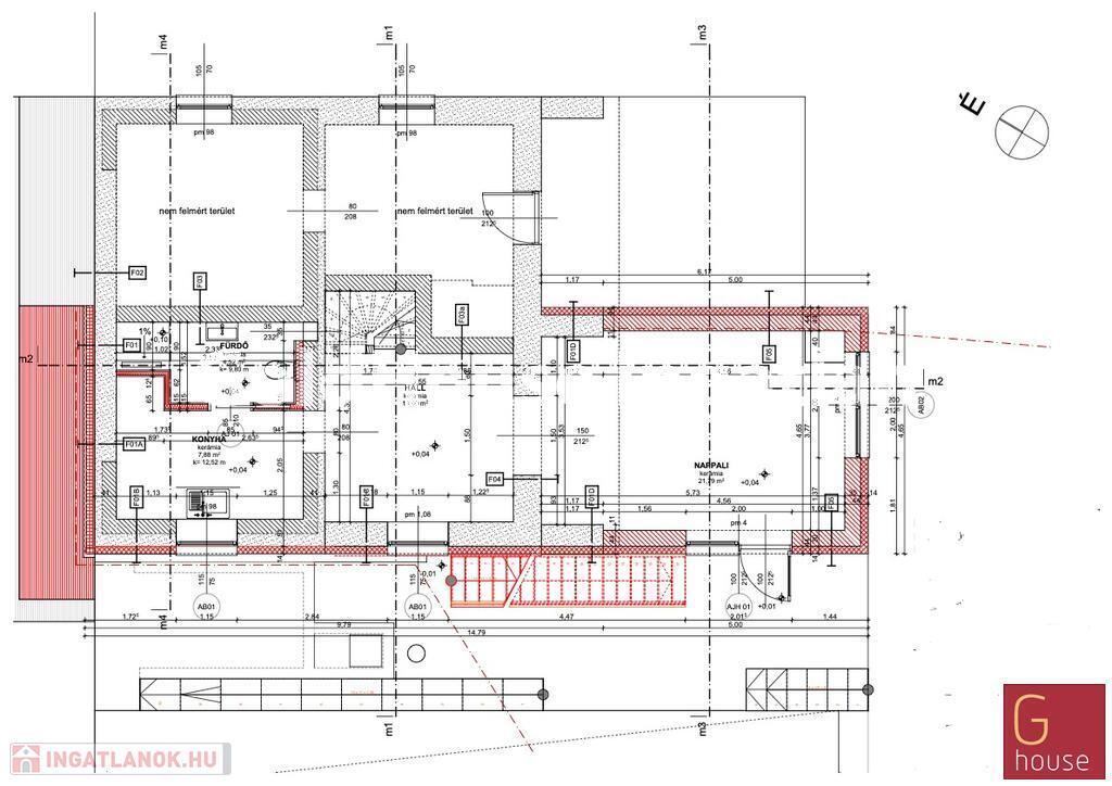 Földszint: Konyha – 7,88 m² , Fürdőszoba – 4,52 m² , Hall (lépcsőfeljáróval) – 13,60 m² , Nappali (duplaszárnyas panorámaajtóval) – 21,79 m²