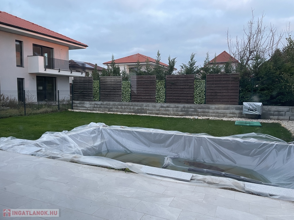 A nappaliból kilépve vár a 20 m2-es terasz, amely közvetlen kapcsolatot biztosít a kerttel és a 24 m2-es, fűthető medencével – tökéletes helyszín a pihenéshez, egész szezonban.