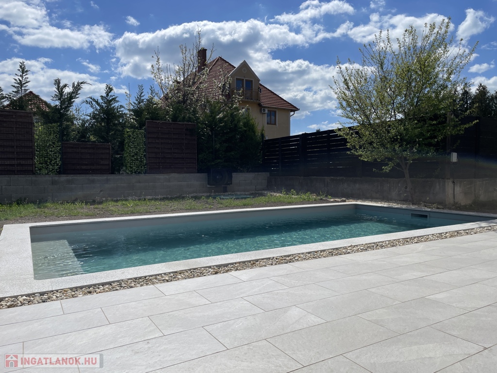 A nappaliból kilépve vár a 20 m2-es terasz, amely közvetlen kapcsolatot biztosít a kerttel és a 24 m2-es, fűthető medencével – tökéletes helyszín a pihenéshez, egész szezonban.