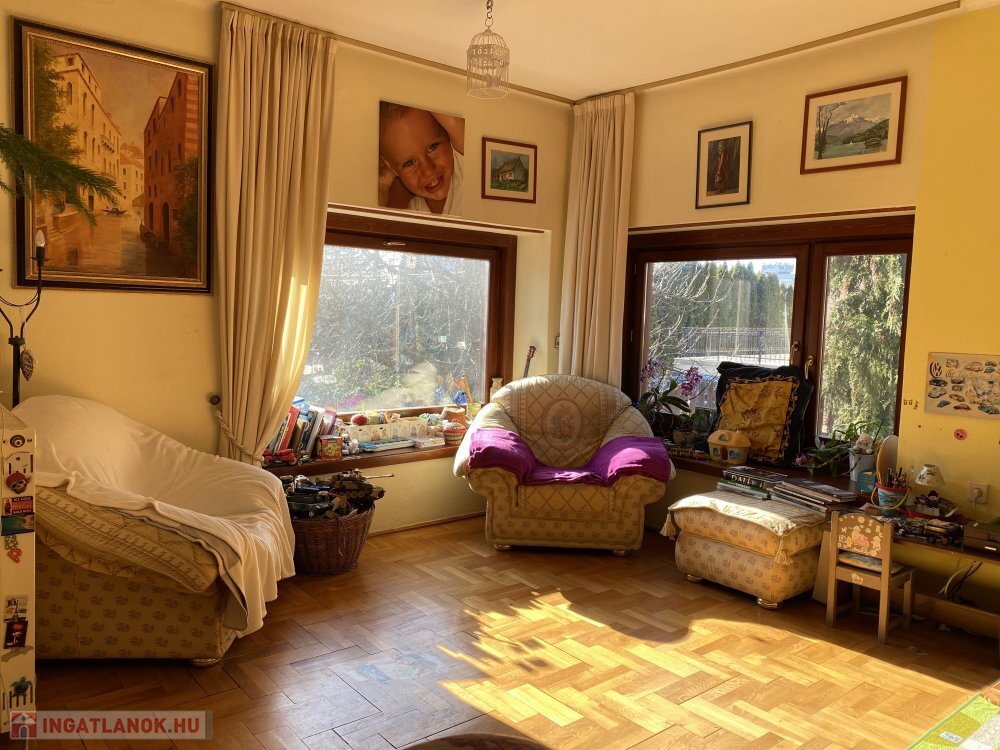 A háromszintes szépen karbantartott lakóház, "csupaüveg" déli frontján minden helyiségébe "ömlik" a fény.