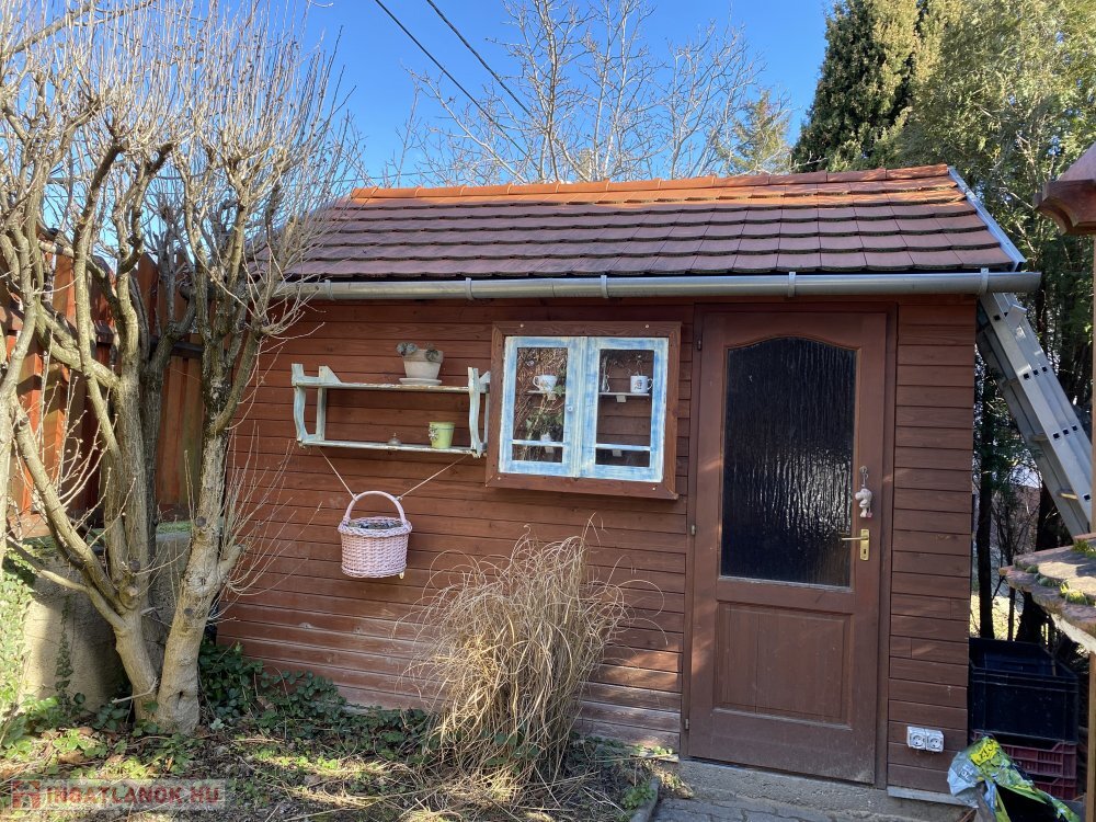 A kertben egy faház, kerti úszómedence, fedett grillterasz/bográcsozó és kút található.