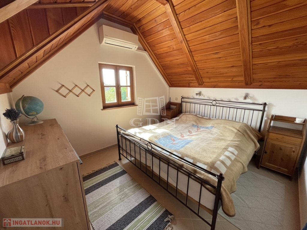 Emelet: 2 hálószoba (20 és 10,2 m²) split klímákkal, sarokkádas fürdő (4,1 m²), külön WC (1,6 m²), tároló