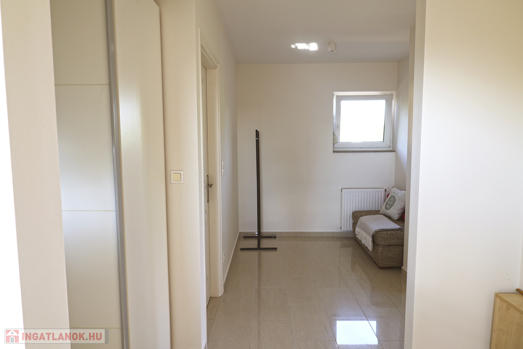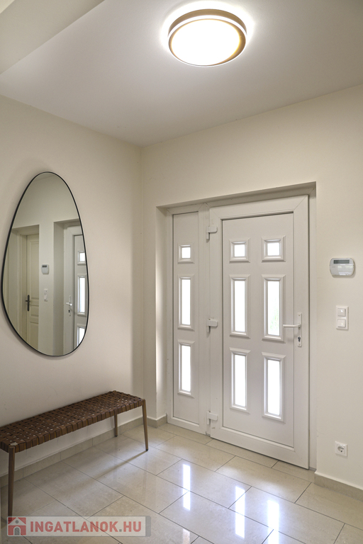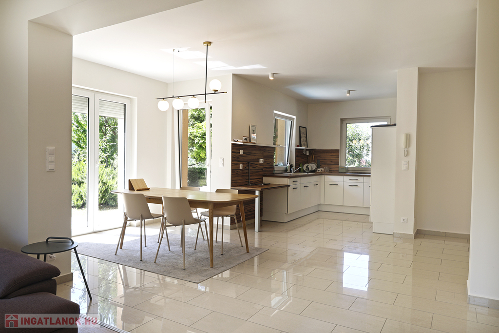 Földszint: előtér–lépcsőház, tágas nappali, konyha–étkező, közlekedő, 1 hálószoba, külön WC, zuhanyzós fürdőszoba, mosókonyha–háztartási helyiség, garázs, fedett terasz.