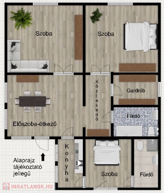 A nagyobb 90 m2-es házban három szoba (hűtő-fűtő klímával felszerelt) , előszoba-étkező, konyha, közlekedő és gardrób helyiség került kialaításra. Két fürdőszoba szolgálja a lakók kényelmét – az egyik zuhanyzós, a másik kádas –mindkettő felújított. Minden helyiség modern burkolatot kapott.