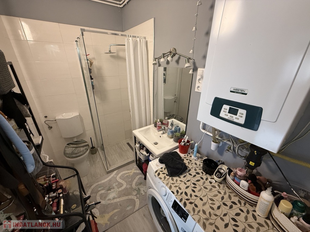 A kisebb, 40 m²-es ház külön bejárattal rendelkezik, saját fürdőszobával, konyhával és egy szobával. Fűtése parapetes gázkazánról történik, klíma és villanybojler szintén rendelkezésre áll.