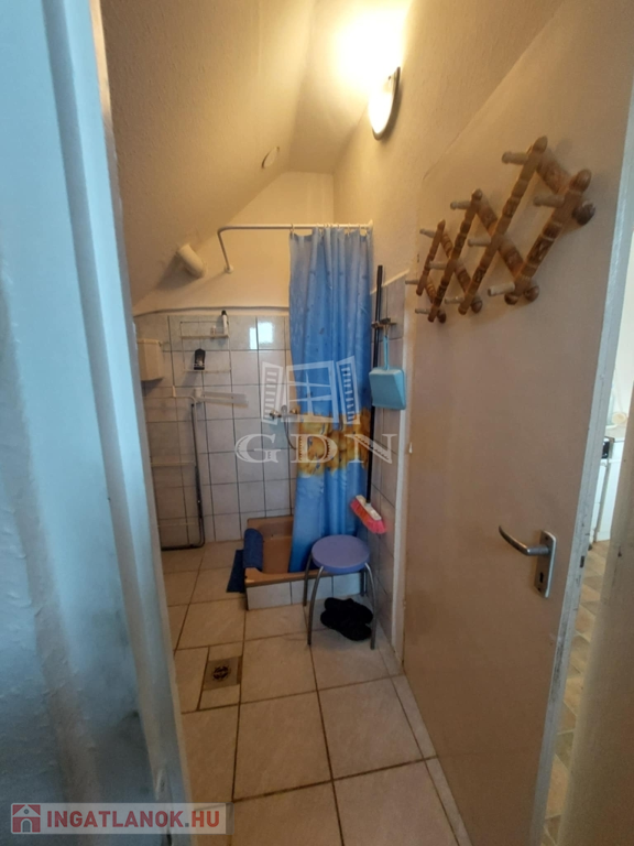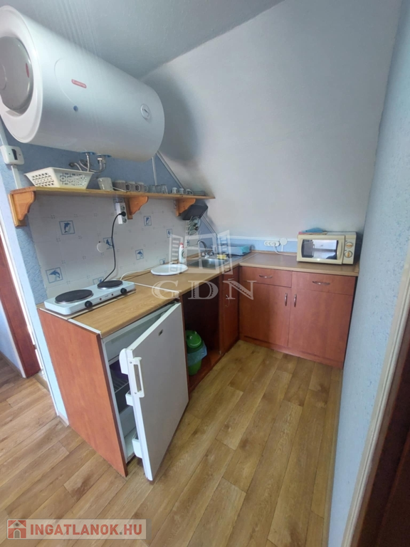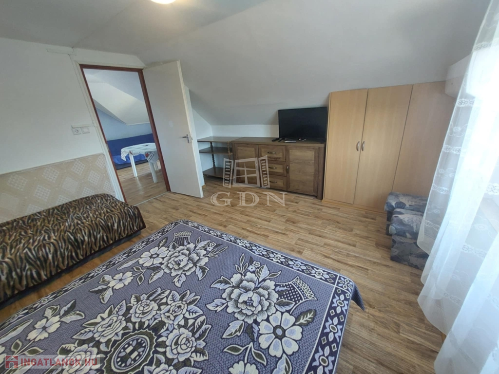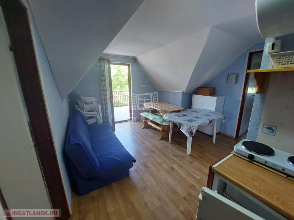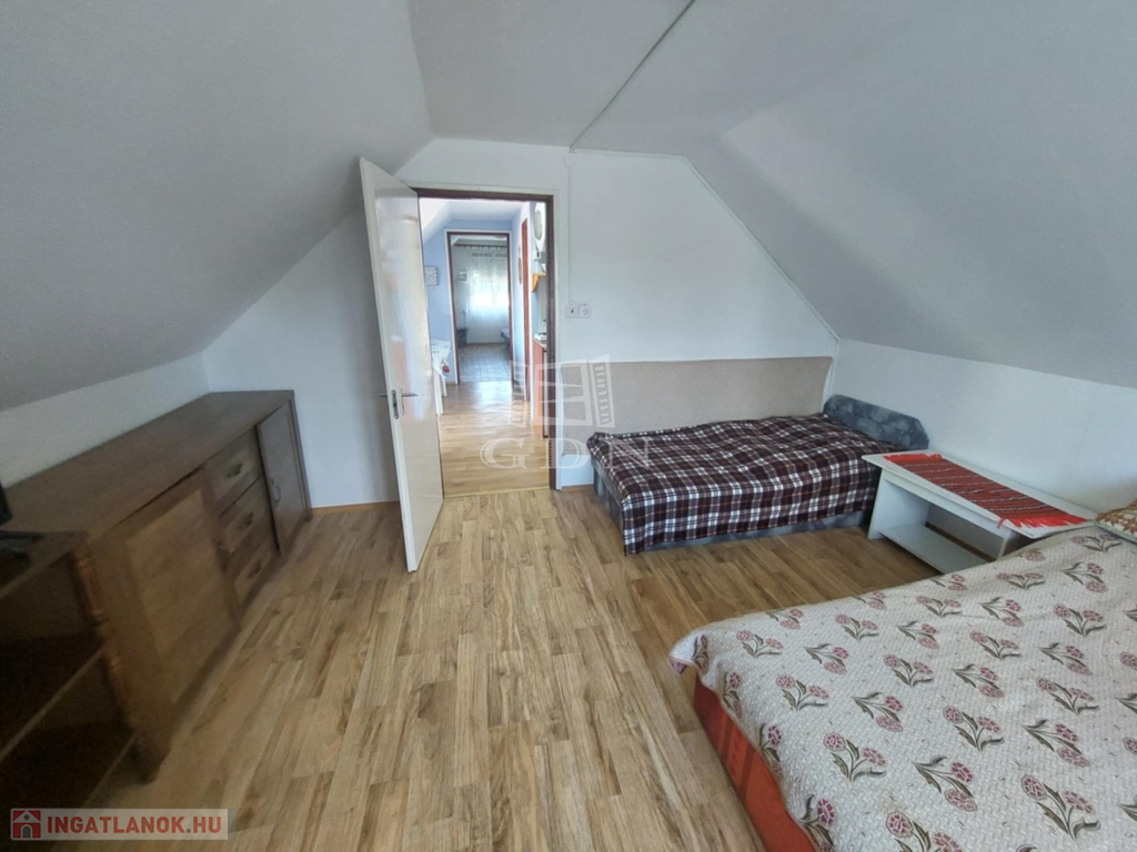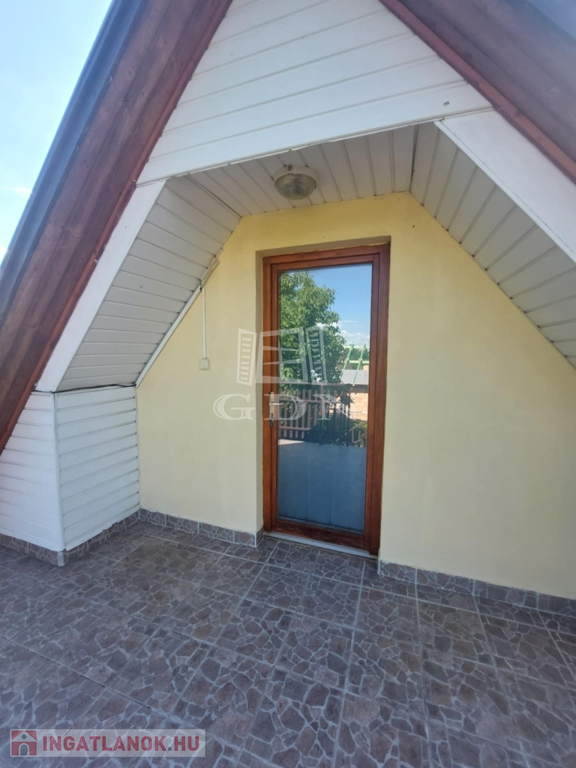 A beépített tetőteret külső lépcsőről érjük el, ahol egy konyha-társalgóból nyílik két hálószoba, valamint a fürdő.