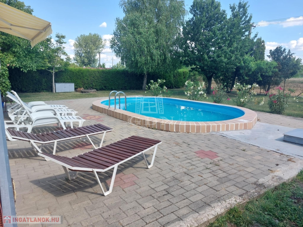Az ingatlan szép, rendezett kertjében egy nagy terasz közepén helyezkedik el a 25 négyzetméteres ovális medence. A medence teljes gépészettel rendelkezik és saját kútból lehet feltölteni.