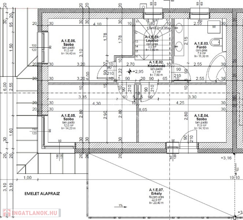 Emelet (50m2): 3 szoba, fürdő+wc, erkély (22m2)