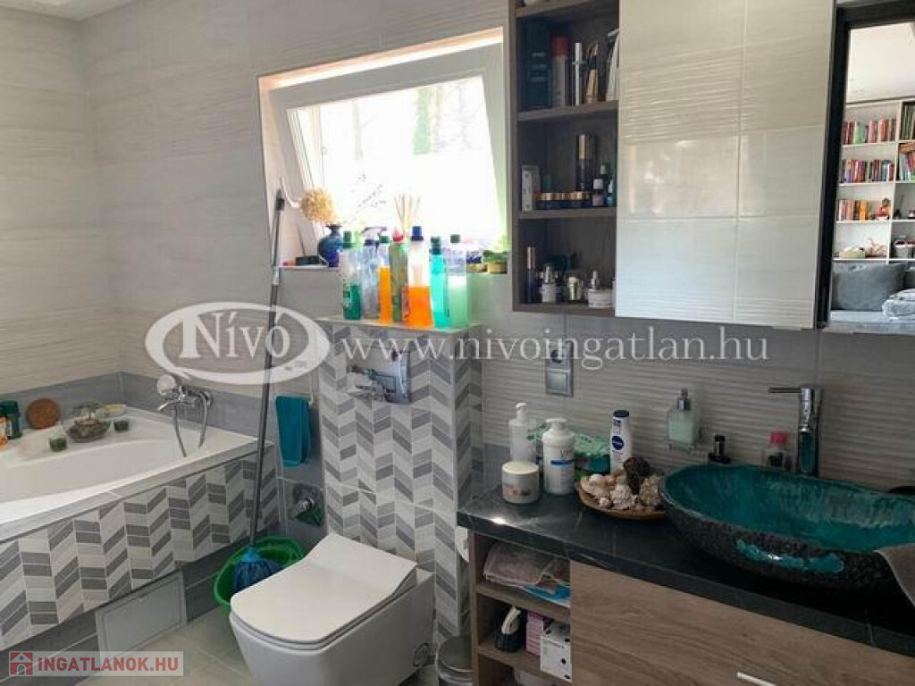 Az épület téglából épült, 10 cm-es szigeteléssel, Bramac fedésű. 2021-ben teljeskörűen fel lett újítva (vezetékek, szaniterek, burkolatok, nyílászárók stb.). Az ingatlan áll egy szuterén szintből, egy emeletből és egy tetőtérből. A világos, kertkapcsolatos szuterén szintet (nagy szoba, fürdőszoba + WC + mosókonyha) kívülről és épületen belül is meg tudjuk közelíteni. A "földszinten" kialakításra került egy amerikai konyhás nappali-étkező, egy fürdőszoba WC-vel és egy gardrób helyiség, erről a szintről nyílik egy balatoni panorámával rendelkező 31,08 m2-es terasz. Az emeleten található egy nagy méretű, tágas, világos nappali-hálószoba-dolgozósarok, külön gardróbbal és fürdőszobával, WC-vel, ahol a nagy üvegfelületen keresztül csodálhatjuk a Balaton látványát.