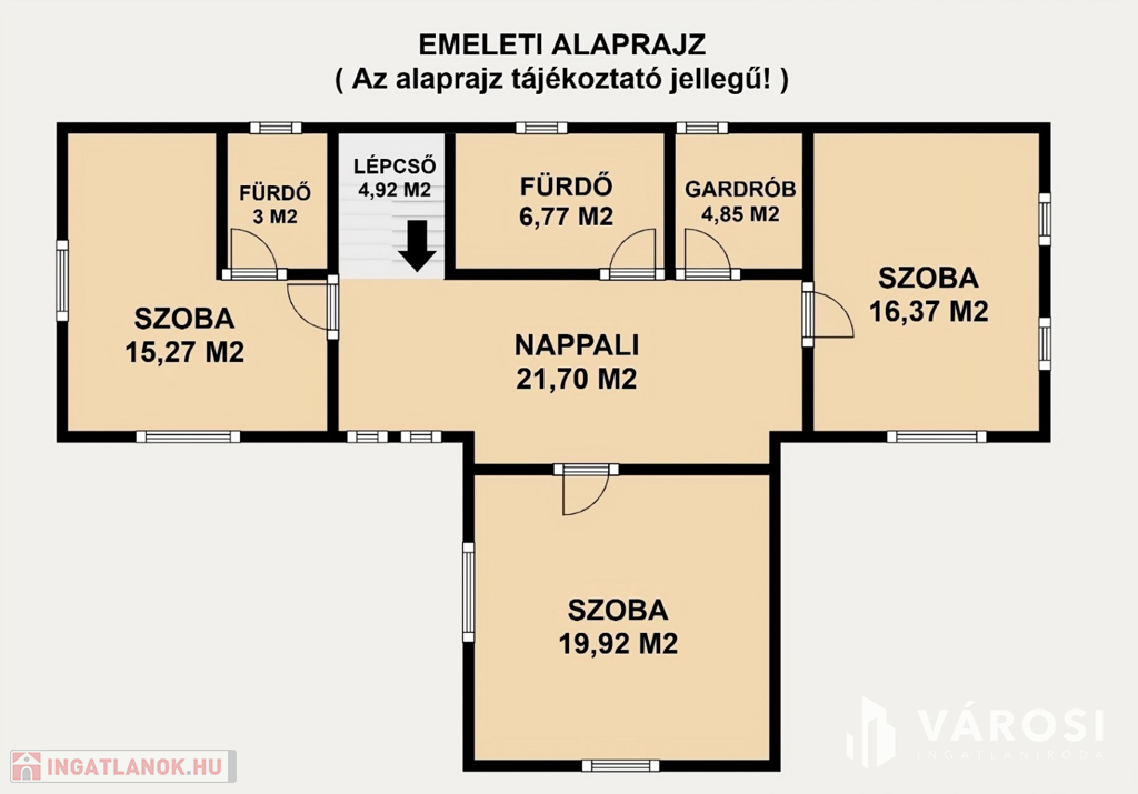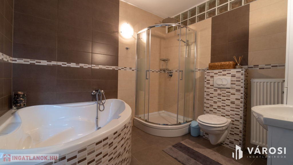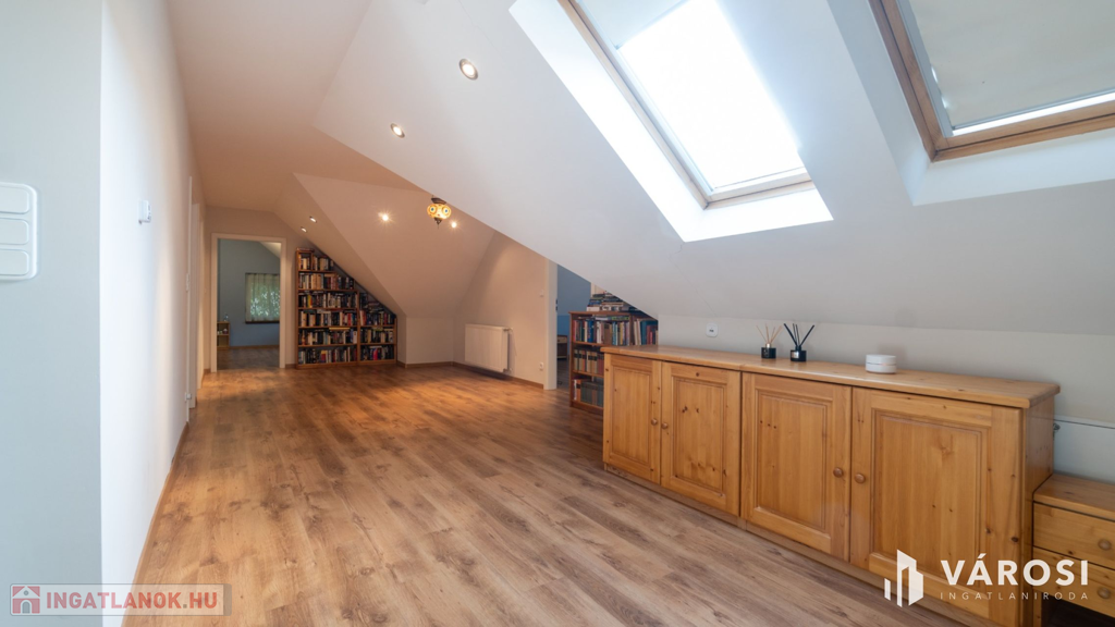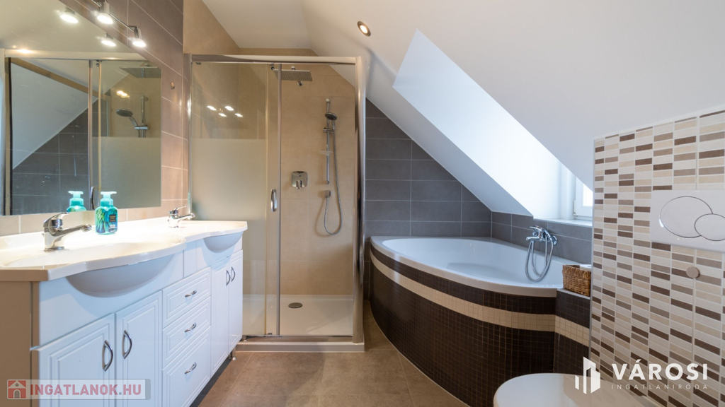 A ház nettó 220 négyzetméteres és egy impozáns 1070 négyzetméteres összevont saroktelekre épült. A földszinten található egy hálószoba saját fürdőszobával, itt kapott helyet a ház központi tere, a 92 m2-es amerikai konyhás nappali, mely garantálja, hogy az egész család és a barátok is bármikor kényelmesen elférjenek. A nappaliból kijárásunk van egy 18 m2-es fedett teraszra. Az utcáról közvetlenül beparkolhatunk a 38 m2-es dupla garázsba, melyből belső átjáróval a mosókonyhába jutunk. Az emeleten található 3 szoba, 2 fürdőszoba, 1 gardrób és 1 közlekedő-nappali.