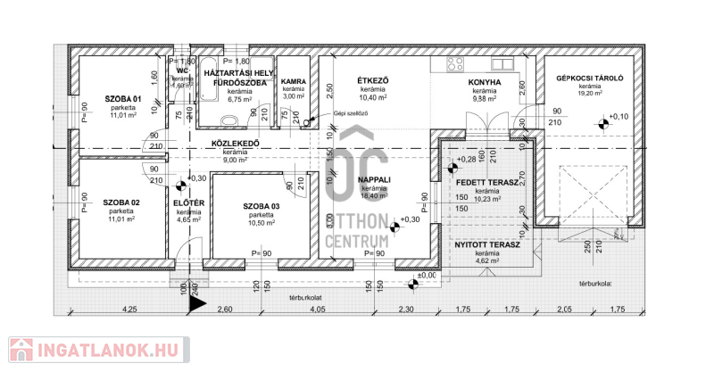 - fedett terasszal kapcsolatos konyha- étkező- nappali, 3 kényelmes méretű hálószoba, fürdőszoba és külön WC, mosókonyha és széles közlekedő