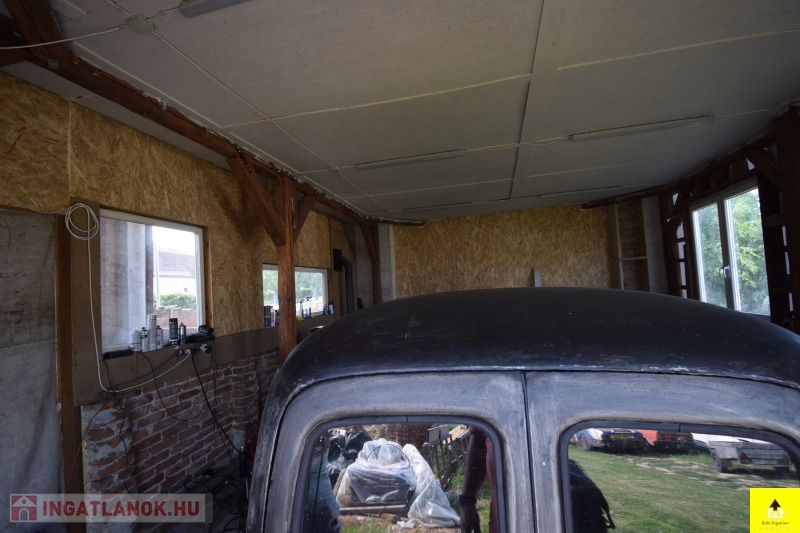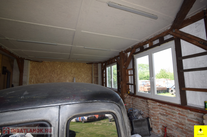 A harmadik és talán a legérdekesebb épület egy 200 m2 alapterületű rendkívül masszív pajta épület, amelynek jelenleg a fele felett van tető. A pillérek állnak és az eredeti elképzelés szerint egy nyitott szín lett volna, de természetesen ez másképp is kivitelezhető. Mivel a térképen az eredeti 200 m2 szerepel ez mindenféle engedély nélkül megoldható. A pajta belmagassága 4 méter !! így akár raktározási célokra is kiválóan alkalmas lehet, de lakóházzá is alakítható. A pajta betongerendával körbe van vasalva és 20 cm vastag Fiber erősítéssel ellátott aljzatbetont kapott így rendkívül erős és masszív lett. Nagy gépek, teherautók, vagy nehéz dolgok tárolására is kiválóan alkalmas lehet. Az épületben egy 45 m2 -es fűthető részben hőszigetelt "pajta műhely" lett kialakítva amely fűthető részben hőszigetelt és könnyűszerkezetes falazattal rendelkezik. A pajta tetőterét pedig szintén többféleképpen hasznosíthatjuk hatalmas méretlének köszönhetően. Lehet tágas lakás, raktár vagy műterem, de hagyhatjuk így nyitottan is az óriási belmagasságának köszönhetően galériásan is.