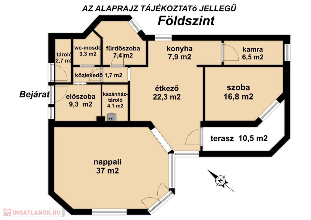 Egy kellemes méretű nappali, konyha-étkező, hálószoba, valamint kamra, fürdőszoba, mosókonyha és külön wc áll rendelkezésre.