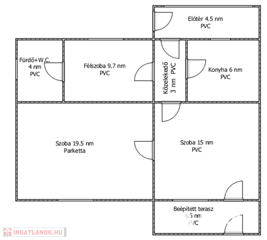 Helyiségei: 2 szoba, 1 félszoba, konyha, közlekedő, fürdőszoba, előtér, beépített terasz.