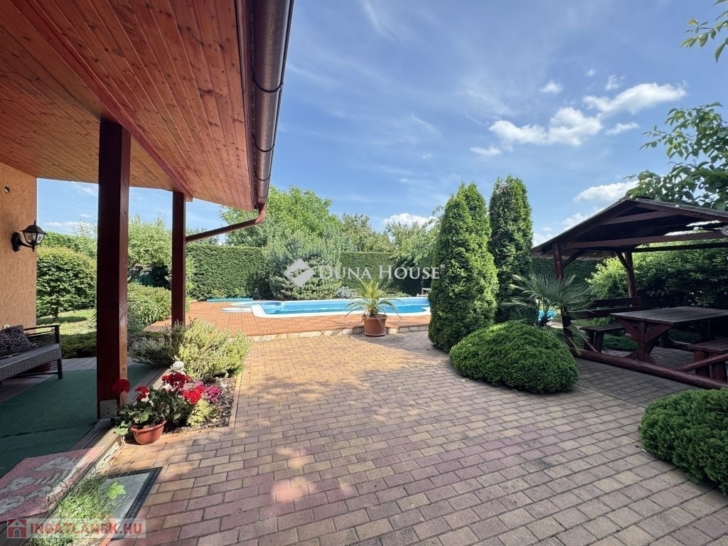A külső tér ugyanilyen átgondolt: a parkosított kertben egy 4×8 méteres, 1,5 méter mély medence kapott helyet jakuzzival, amely tökéletes a nyári felfrissüléshez vagy egy nyugodt esti lazításhoz.