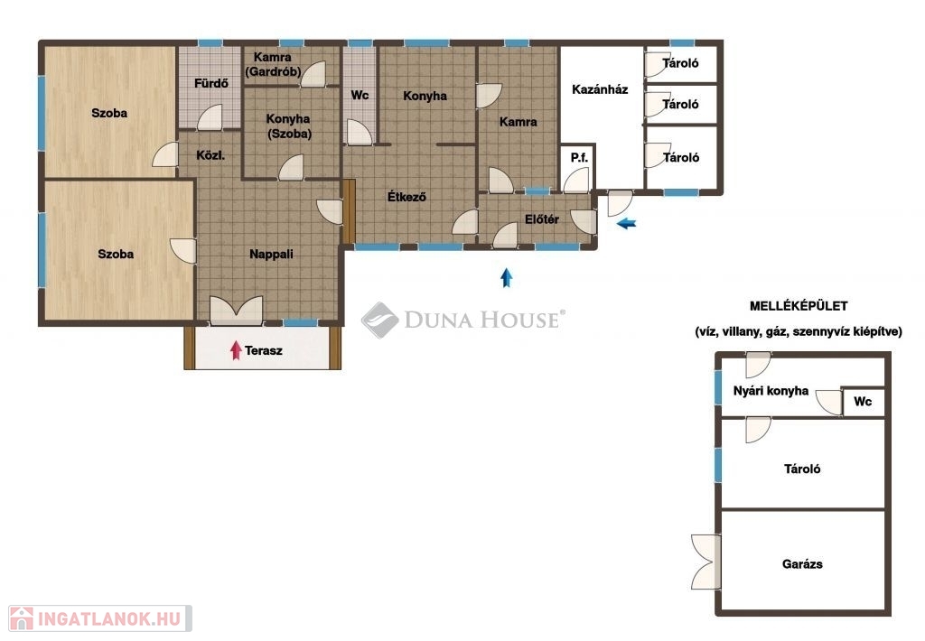 A telken található egy melléképület, amelyben garázs, nyári konyha, tároló és WC kapott helyet. A melléképület is teljes közművel rendelkezik (víz, villany, gáz, szennyvíz).
