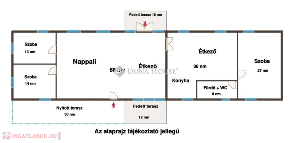 A házhoz tartozik két fedett (12 és 16 nm) és egy nyitott terasz (30 nm).