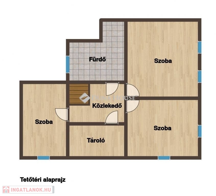Az emeleten található egy praktikus tároló is, amely tökéletes megoldást kínál ruhák és egyéb tárgyak tárolására.