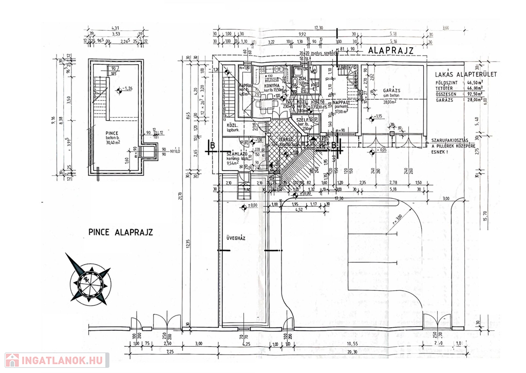 A lakóház földszinti lakótere 46,5 m2, a konyha-étkező helyiséggel egy légterű nappali, illetve WC és zuhanyzó található ezen a szinten, a nappaliból egy vasbeton szerkezetű lépcsőn keresztül juthatunk a tetőtérbe. Ezen kívül a földszinten kialakításra került, egy dupla garázs, amely elektromos, magasított garázskapuval ellátott, így akár magasabb autó, kisteherautó tárolására is alkalmas. Szintén a földszinten található egy 45 m2-es üvegház, ami akár télikertként, vagy pihenő, szabadidős helyiségként, akár wellness helyiségnek is kialakítható, mivel víz és szennyvíz ebben a helyiségben is kiépítésre került.