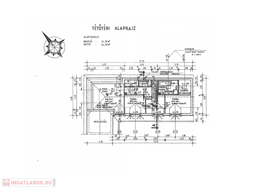 Az épület tetőtere 46 m2 hasznos területű, három hálószoba, egy fürdőszoba, szárítóhelyiség/mosókonyha került kialakításra.