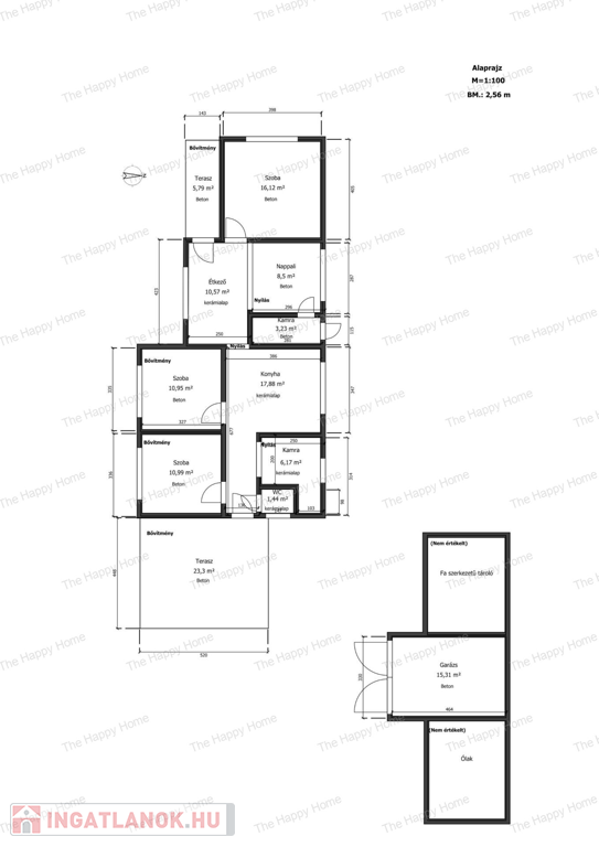 Alapterület: 86 nm lakótér + 23,3 nm és 5,79 nm-es terasz + 15 nm garázs + melléképület