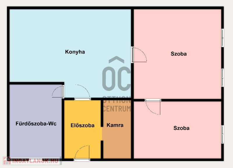 Helyiségei: 2 szoba, konyha-étkező, fürdőszoba-wc, kamra, előszoba.