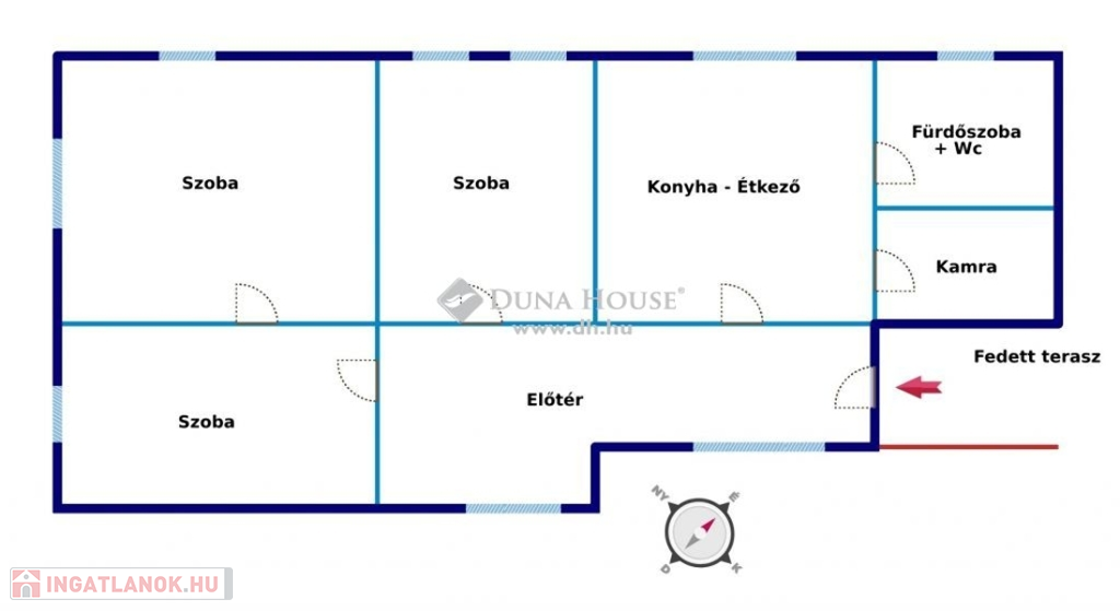 Az ingatlanban 3 szoba, egy étkezős konyha, egy fürdőszoba+wc, egy kamra, és egy tágas, világos előtér helyiségek találhatóak. Szinte minden helyiség ablakos, melynek köszönhetően a fényviszonyok és a ház szellőztethetősége is kedvezőek. Kisebb átalakítással a ház akár 4 szobássá is átrendezhető.