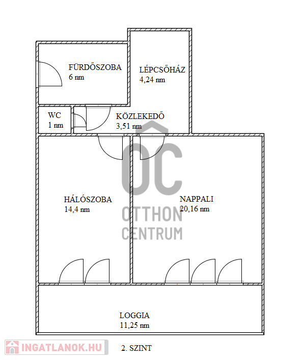 - 2. félszint: tágas nappali loggiával, hálószoba loggiával, fürdőszoba (kád + zuhany), WC