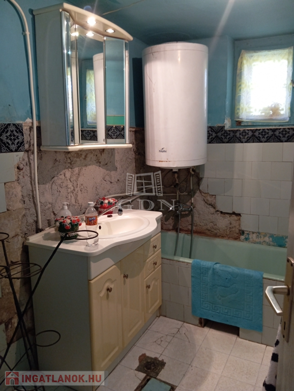 A fürdőszoba még magán viseli egy korábbi csőtörés nyomait, melyet követően a vízvezetékek a közelmúltban cserélve lettek.