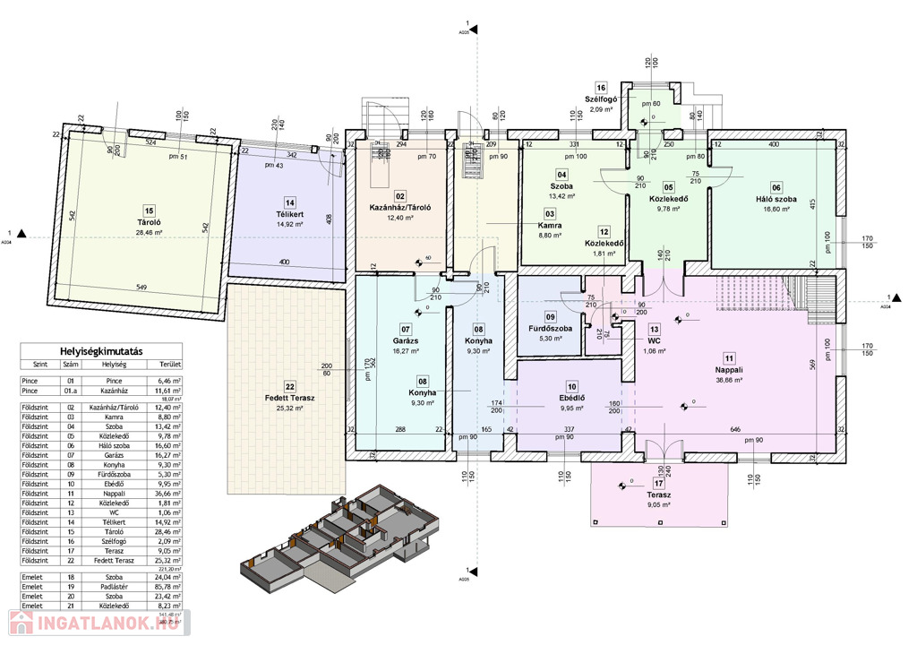 A lakóházzal egybeépített garázsban egy jármű fér el, külön egy kisebb garázs, műhely tároló helyiség található.