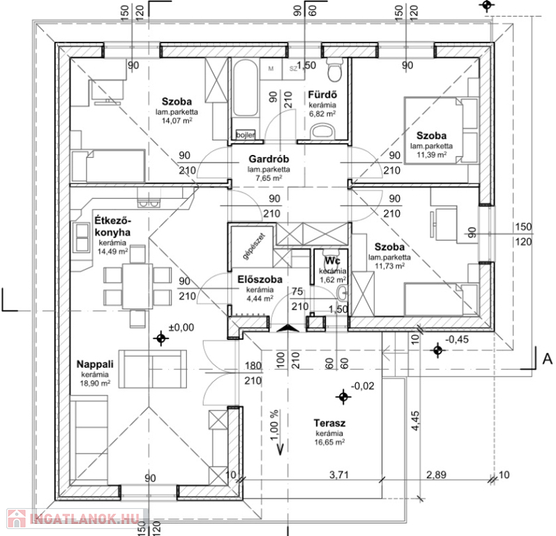 Nappali + 3 hálószoba (14, 11, 12 nm), fürdőszoba WC-vel + külön WC.