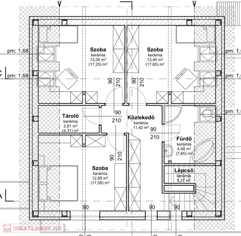 Emelet tetőtér beépítésű, 3 hálószobából kettő tetőtéri ablakkal, egy pedig rendes oldalfali ablakkal ellátott. Hasznos alapterületük 17 nm körüliek. Ezen a szinten van még egy 7 nm-es fürdő WC-vel, illetve egy tároló-gardrób helyiség (4,31 nm)