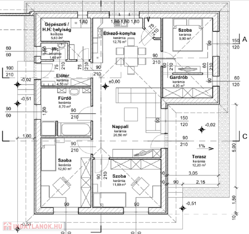 Nappali + 3 hálószoba (9,10,12 nm), fürdőszoba WC-vel + külön WC.