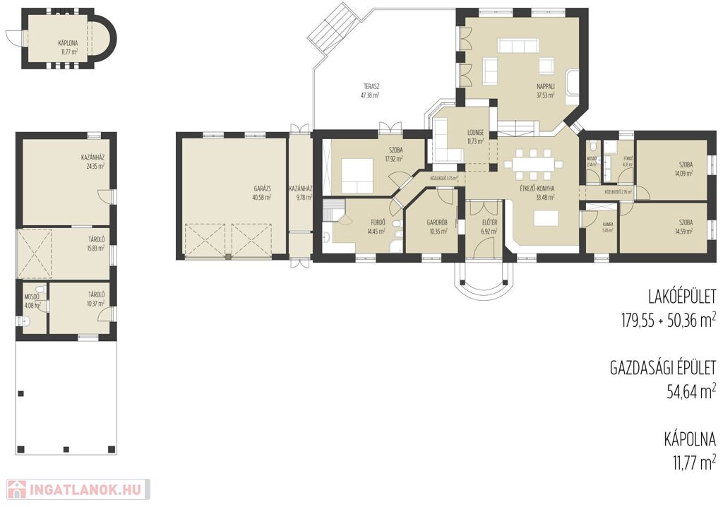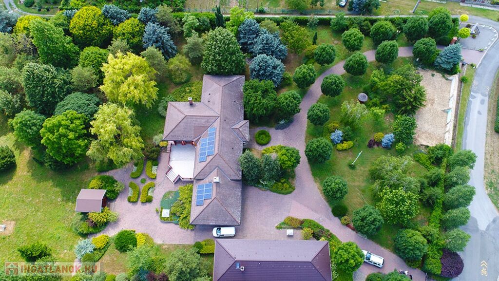Telek: Az épülethez számos melléképület kapcsolódik: kétállásos garázs, fedett kocsibeállók, tágas tárolók, kazánház, valamint egy külön épület, amely jelenleg nyárikonyhaként és fatárolóként funkcionál, de akár önálló lakórésszé is alakítható. A 15.000 m2-es telek teljesen körbekerített, három autóbejárattal, távirányítható kovácsoltvas kapukkal, térkövezett úthálózattal rendelkezik. A kert fenntartását fúrt kút 40m-es mélységgel, 25 méteres bőhozamú vízoszloppal és egy 20 m- es ásott kút, valamint egy 50 köbméteres esővízgyűjtő ciszterna segíti, az öntözőrendszer az egész területre ki van építve. A birtokon még egy betemetett, de bármikor használatba vehető kültéri medence is található teljes gépészettel, valamint pince és egy romantikus kerti filagória.