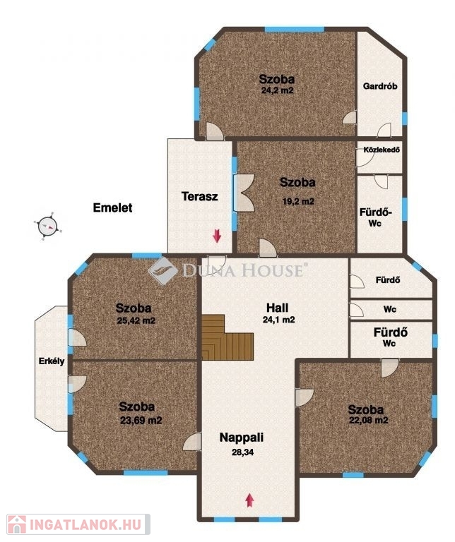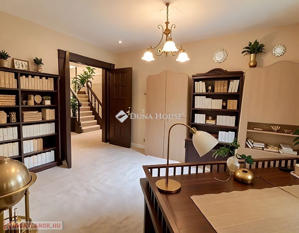 A földszinten többek között van egy tágas konyha-étkező, egy 50 m2-es nappali, egy dolgozószoba, fürdőszobák, innen egy impozáns, ívelt lépcső vezet az emeletre, ahol négy napfényes hálószobát, konditermet, 3 fürdőszobát, közösségi helyiségeket, erkélyeket találunk.