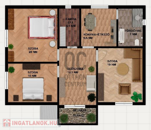 -3 nagyon tágas szoba, konyha-étkező, előszoba, kamra+padlásfeljáró, fürdő+WC