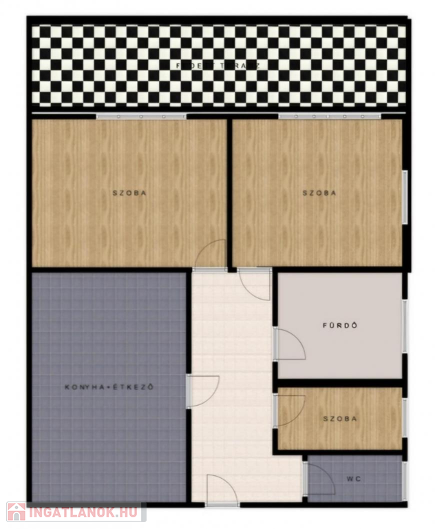 Jelenlegi elrendezése: előszoba,konyha + étkező,fürdőszoba, külön wc,2 nagy szoba,1 félszoba (gardróbszoba) valamint egy polikarbonáttal fedett terasz.