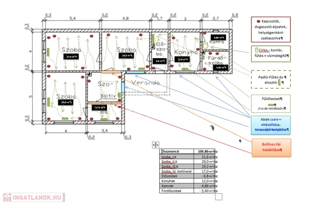 A képeken jól látszik a ház jelenlegi tulajdonosainak gondos munkája, hiszen az épület teljes belső felújításakor nemcsak a víz-és villanyvezetékeket cserélték, hanem komplett fűtés-korszerűsítést hajtottak végre-aljzat szigeteléssel, egyedi (gáz) cirkó fűtésűre alakították, mellette meghagyva a hangulatos cserépkályha elhelyezés lehetőségét (a kémény felújítva!), ügyelve a letisztult színvilágú világos és tágas terek kialakítására. A világos, napfényes házban 8 éve cserélve lett a nyílászárók nagy része, a bejárati- és a teraszajtók. Új hideg - meleg burkolatok kerültek lerakásra.