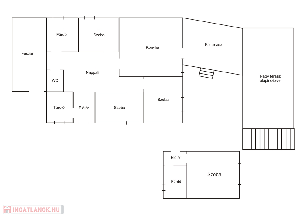 A nagy házban (80 m2) egy előszoba, 3 szoba + nappali, tároló, wc, fürdőszoba és egy nagy konyha terasszal (+15 m2) került kialakításra az átépítés során. A ház mögött egy fedett tároló (20 m2) található. A ház előtt egy hatalmas (28 m2) alápincézett terasz helyezkedik el, 3 pincehelységgel, valamint a pincék előtt még egy kisebb fedett terasz (11 m2) van.