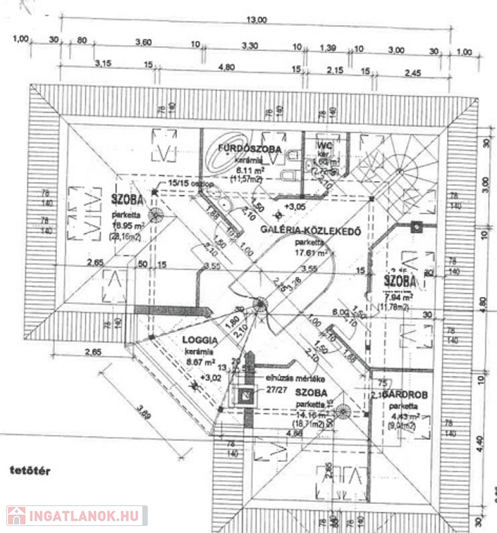 Tetőtér: két háló (br. 28 és 18 nm), egy félszoba, gardeób, fürdő, külön WC, panorámás erkély