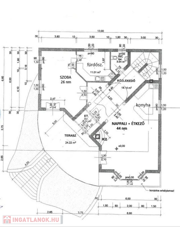 Földszint: nappali amerikai konyhával (44 nm) és teraszkapcsolattal, dolgozószoba (26 nm) , fürdő (11 nm) , WC, háztartási helyiség