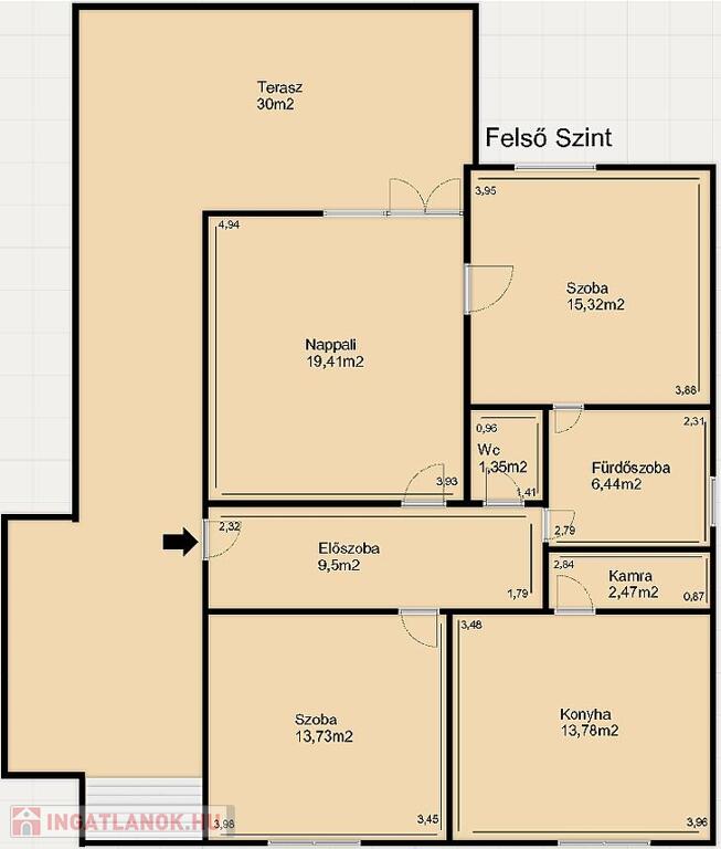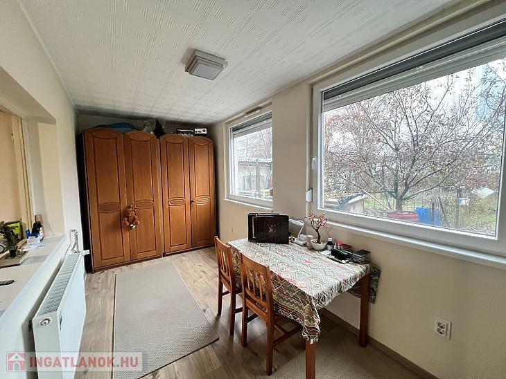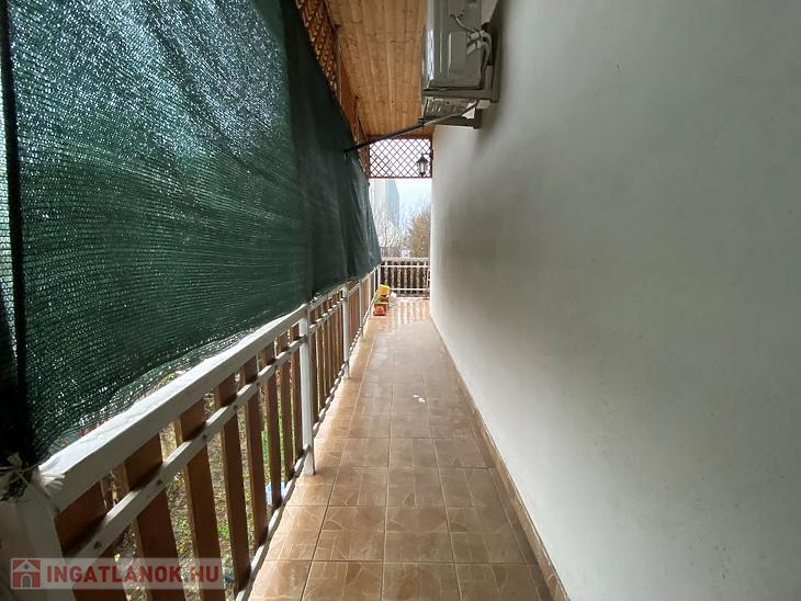 A felső szint közepes állapotú, fa típusú thermo üveges nyílászárókkal, redőnnyel. A szobákban fa parketta a többi helyiségben járólap található.