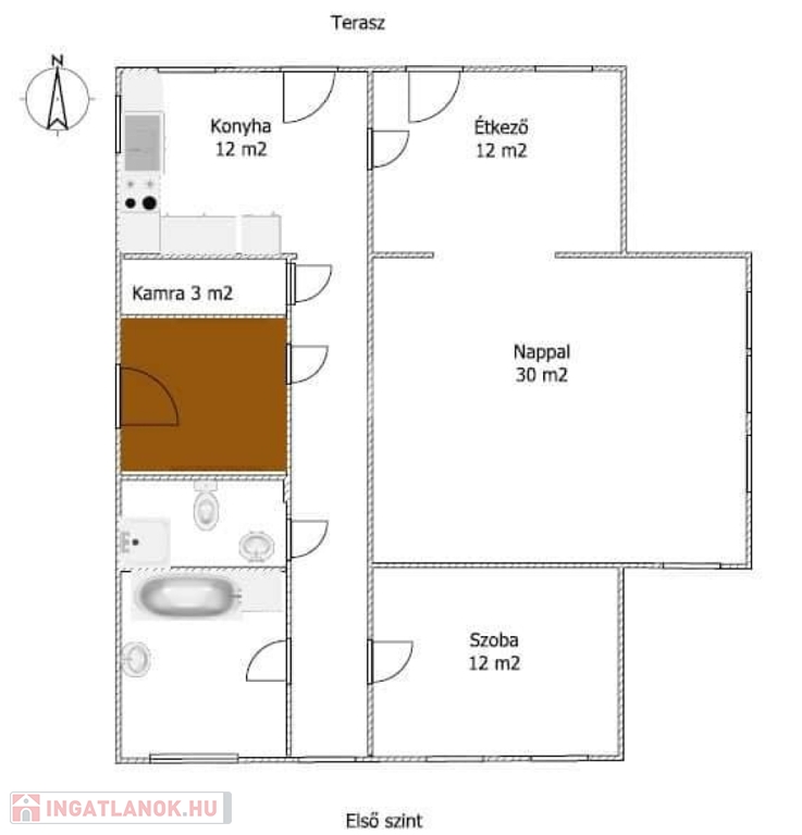 - nappali + étkező + konyha közvetlen teraszkapcsolattal