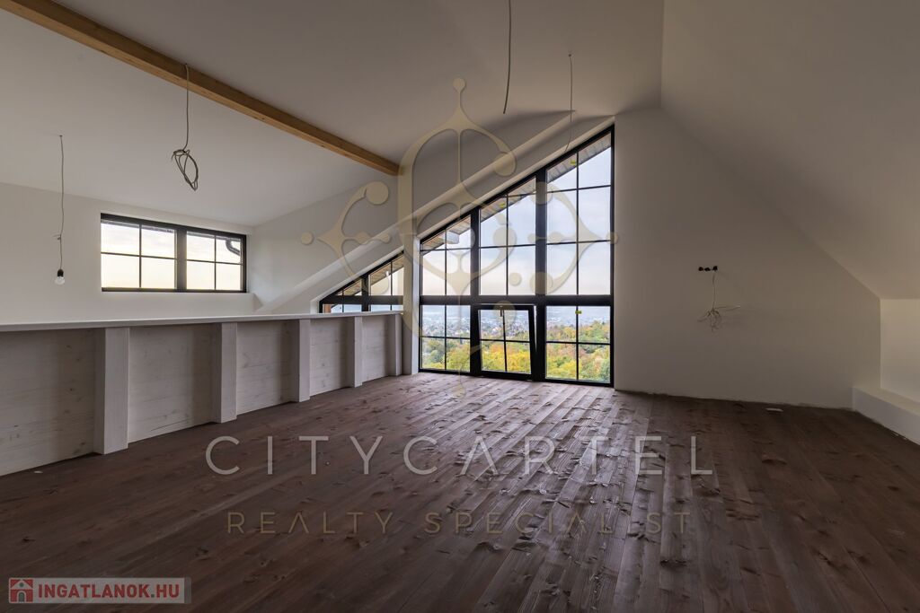 - A kertszinten két szoba és egy zuhanyzós fürdőszoba került kialakításra, közvetlen kertkapcsolattal és egy 20 nm-es terasszal. Erről a szintről is csodás kilátás nyílik, ami különlegessé teszi az ingatlant – hiszen még a kertből is panoráma tárul elénk. Ezen a kertrészen akár egy kisebb medence is kialakítható, tovább fokozva a megélhető nyugalmat és luxust.
