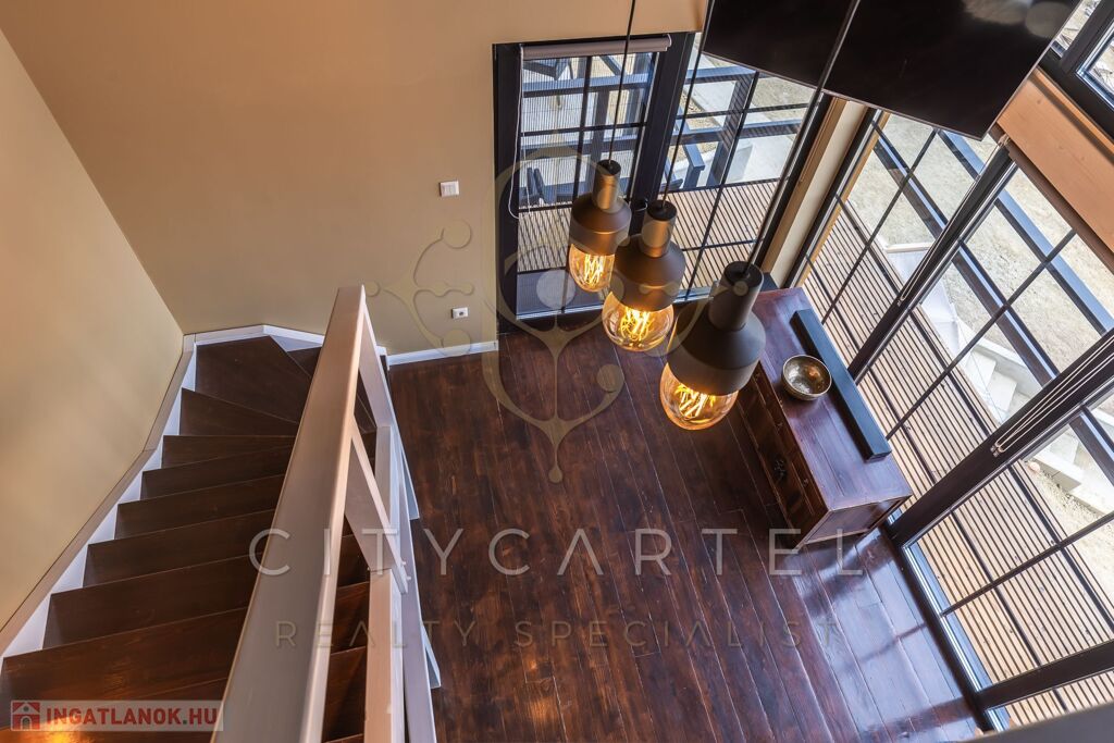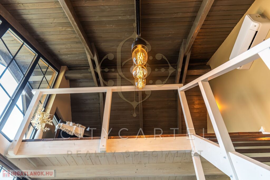 - A felső szinten egy kádas fürdőszoba, valamint egy galériás, jelenleg nyitott, de igény esetén könnyedén zárttá alakítható 34 nm-es szoba kapott helyet.