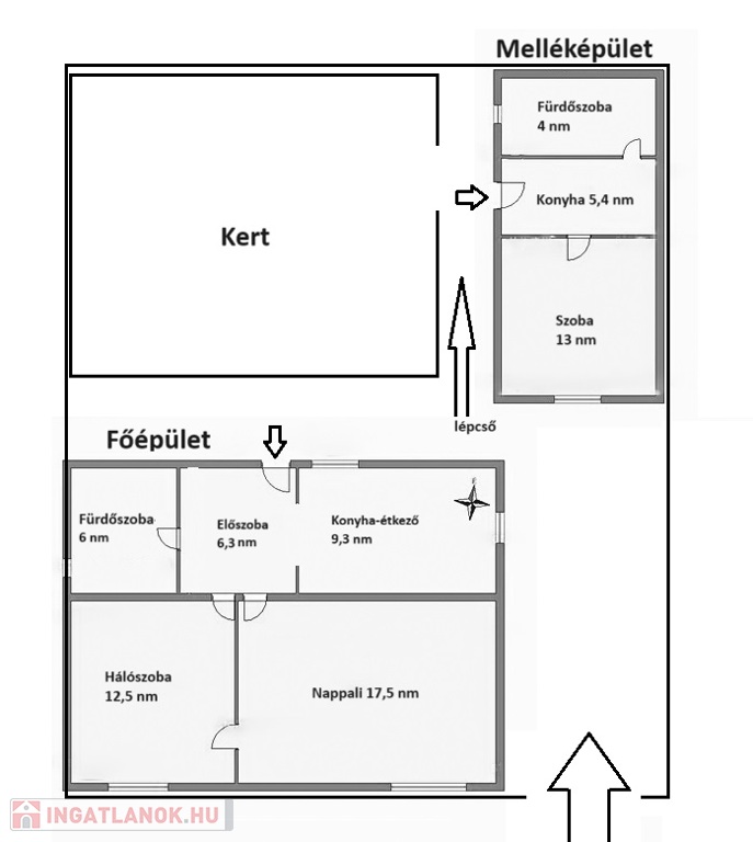 A nagyobb épület ~50 nm-es és egy nappalit (17.5 nm), konyha-étkezőt (9.3 nm), hálószobát (12.5 nm), fürdőszoba-WC-t (6 nm), és előszobát (6.3 nm) tartalmaz. A szobák délre néznek, tehát elég világosak.