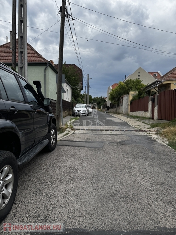 Enyhén lejtős telek, két utcafronti bejárattal (kb. 15 m széles)