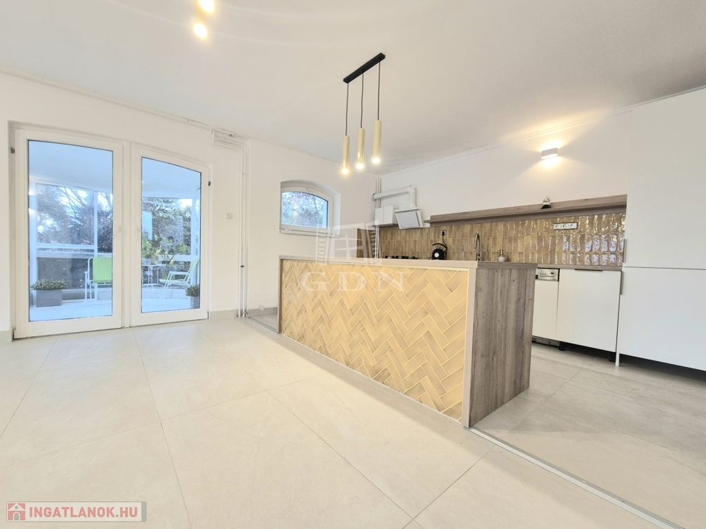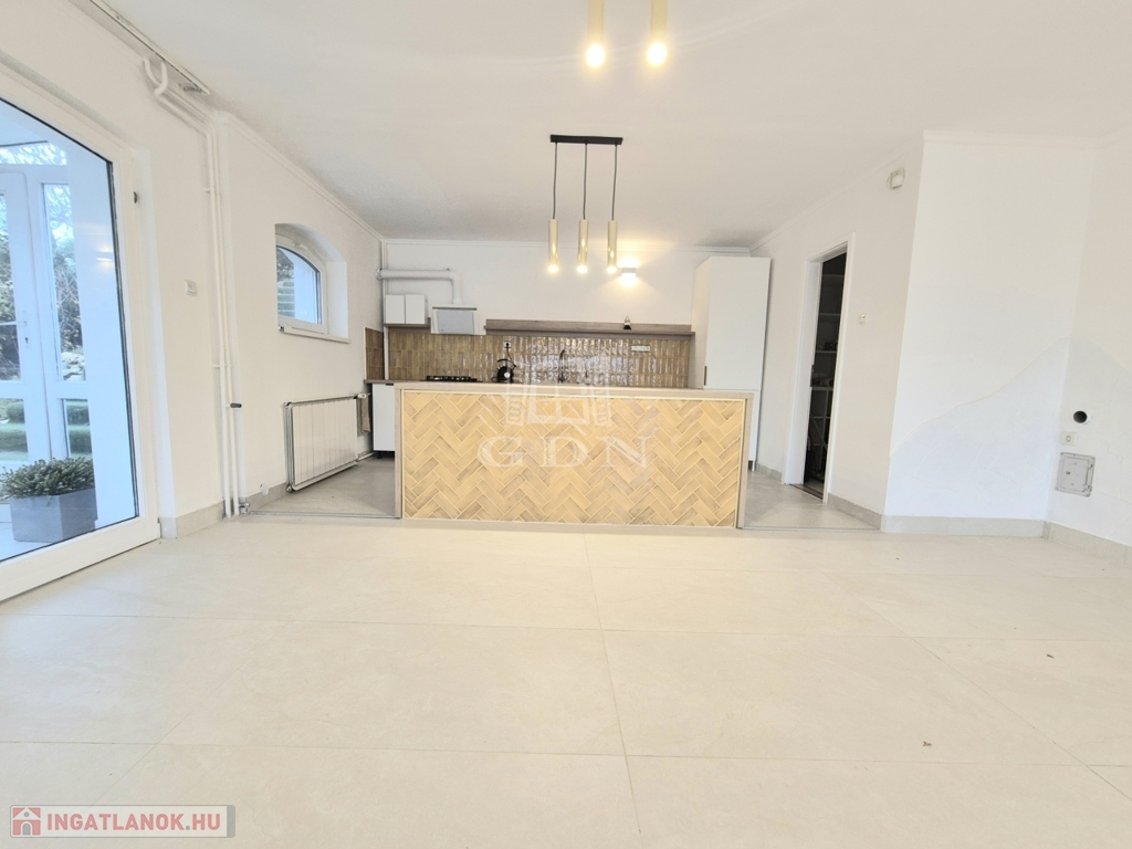 A földszint egy 50 m2-es, erkélykapcsolatos, pazar élményt nyújtó amerikai-konyhás nappalit, vizesblokkot, az emelet pedig két erkély és egy kertkapcsolatos hálószobát, kádas fürdőszobát foglal magába.
