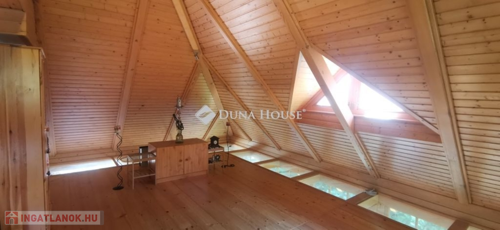 Innen jutunk fel a kétkarú lépcsőn az emeletre, amely egy egy légterű, fenyőfával burkolt tetőtéri nappali dolgozósarokkal. Ez egy légkondcionálóval ellátott, napfényes, hatalmas belső tér, amely sok lehetőséget rejt magában, plusz érdekes megoldás, hogy körben üvegpadló van, amely a fölszinti nappalit is plusz természetes fénnyel látja el. Nagyon hangulatos, a fényképek nem adják vissza, hogy mennyivel növeli a térérzetet ez a különleges padló kialakítás.