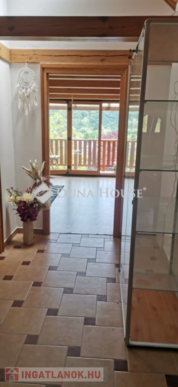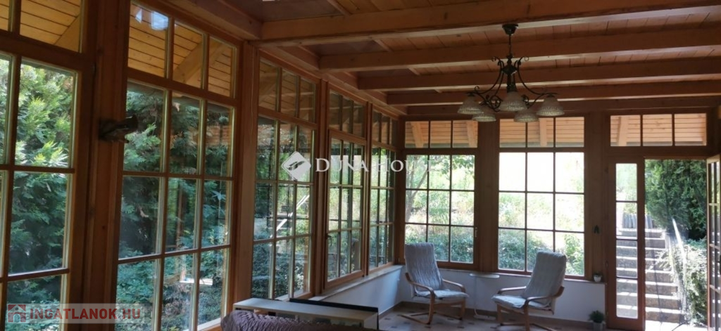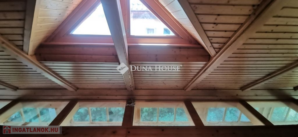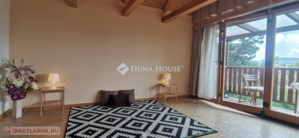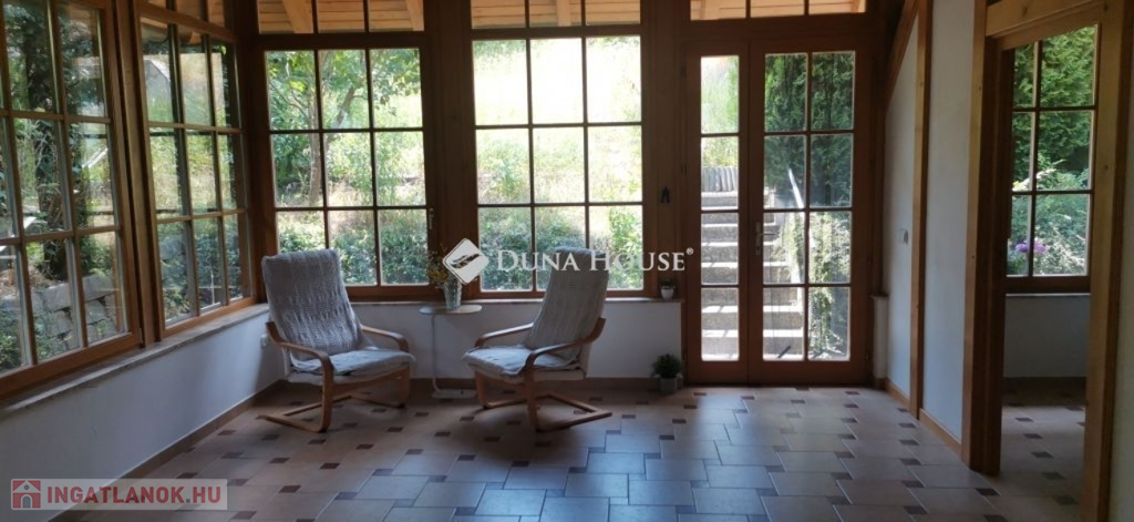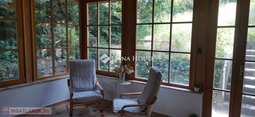 A ház 2005-ben épült, egyedi kialakítású, tetőtér beépítéses, kétszintes tégla családi ház. Az ingatlan egyik nagy előnye, hogy akár két generáció együttélésére is alkalmas. Együtt de mégis külön! A házat egy hatalmas kert, borospince, nagyméretű garázs, valamint további autóbeállási lehetőség teszi még kényelmesebbé a nagycsaládosok számára.Fűtése, meleg víz ellátása gáz cirkóval megoldott, a földszinten padlófűtéssel kiegészítve.A két generációs házban az egyik lakrész 35 m2 nagyságú, a földszinten a bejárattól jobbra található, amely áll egy előtérből nyiló szobából, konyhából és fürdőszobából, wc-vel. A konyhából egy átadó ablak nyílik a nappaliban lévő étkezőasztal felé, amely a családi összejöveteken praktikus megoldás a vendégek kiszolgálására. A nappali különös hangulatát a három oldalán elhelyezkedő kazettás fa ablakok adják, melyek révén mintha közvetlenül a fák tövében ülnénk, miközben szemlélhetjük a természet zöldjét az énekesmadarak, a mókusok játékát. Igazán különleges érzés, bent vagyunk, de mégis kint érezzük magunkat!A másik lakrészhez tartozó konyha a tágas nappali túloldaláról nyílik, amely a hátsó kertre nyílik és az oldalkertre néz, modern és kényelmes U-alakú elrendezésével. Itt található még egy háztartási helység és egy wc mosdóval. Innen jutunk fel a kétkarú lépcsőn az emeletre, amely egy egy légterű, fenyőfával burkolt tetőtéri nappali dolgozósarokkal. Ez egy légkondcionálóval ellátott, napfényes, hatalmas belső tér, amely sok lehetőséget rejt magában, plusz érdekes megoldás, hogy körben üvegpadló van, amely a fölszinti nappalit is plusz természetes fénnyel látja el. Nagyon hangulatos, a fényképek nem adják vissza, hogy mennyivel növeli a térérzetet ez a különleges padló kialakítás.A felső szinten ezen kívül egy kisebb szoba, gyerekszoba található, melllette zuhanyzós fürdőszoba wc-vel és a hálószoba a teljes faltól-falig tartó diófa terasszal! Erről a fedett teraszról is lenyűgöző, örökpanorámás kilátás nyílik a budai hegyekre, amelyet a teljes szélességében eltolható nyílászárókkal élvezhetünk maximálisan. A kert hatalmas, kissé emelkedik felfelé a kert vége felé, felúton a domboldali borospince, amely egy földdel borított boltíves hobbit pince.A ház szigetelt, szépen bevakolt, nagyon jó állapotban van, a tulajdonosok építették a család részére, kezdetnek nyaralóként, aztán állandó lakhelyként szolgált. Jelenleg nem lakják az ingatlant, gyorsan birtokba vehető. A környék csendes, pár utcával odébb található buszjárat 10 perc alatt Hűvösvölgyben van, onnan a város fél óra alatt elérhető. A közelben óvoda, iskolák, kisebb boltok, éttermek, szolgáltatók megtalálhatóak és persze rengeteg kirándulási lehetőség.Nézzük meg együtt, ne maradjon le erről a hangulatos, egyedülálló ingatlanról! Töltse már itt a nyarat!